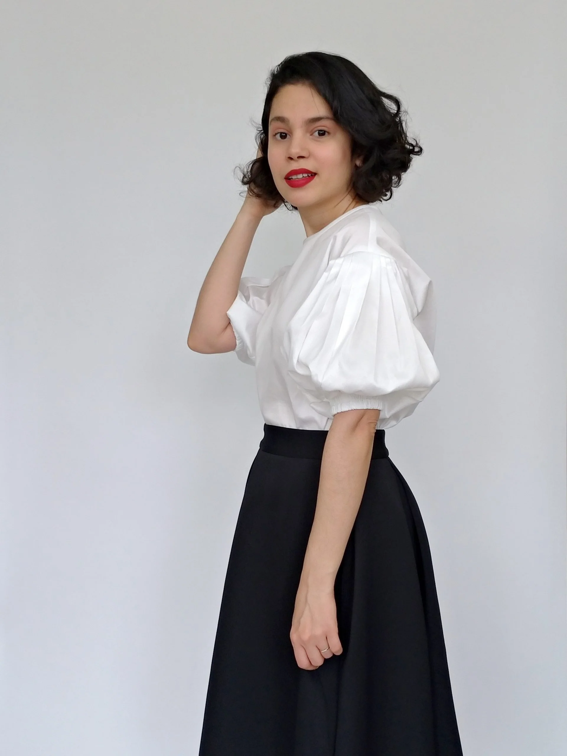 Buy the Cologne Blouse sewing pattern from Bella Loves Patterns. Cologne is a stylish loose-fit blouse with drop shoulder seams. It has lantern-shaped sleeves in two lengths, a short version and a 3/4 length for a more dramatic look. The sleeves have deep pleats at the top and double elastic cuffs.