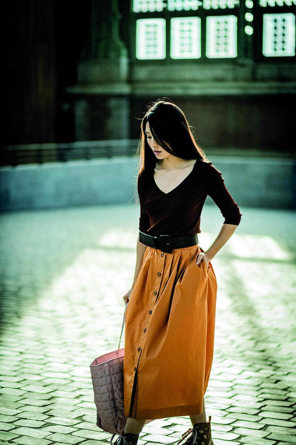 Buy the Alix Skirt sewing pattern from Fibre Mood. This comfy button-down skirt has it all: subtle pleating, a waistband with sturdy belt loops (you choose whether to pair a belt with it or not), convenient hidden side seam pockets, and a wide topstitched hem. This pattern is mid-length, but making Alix shorter or longer is a breeze to do.