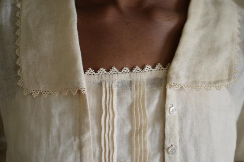 The back of the blouse extends over the shoulders to meet the lightly gathered front, and gathers at the centre back waist into a self-fabric tie or ribbon, which encircles the waist to tie in front. The long collar falls softly over a centre panel, or vestee, forming a deep rectangular neckline. Tiny buttons close the blouse on the left side. Long set-in sleeves gather into wide turned-back cuffs. The traditional curved hemline is slightly shorter in back.