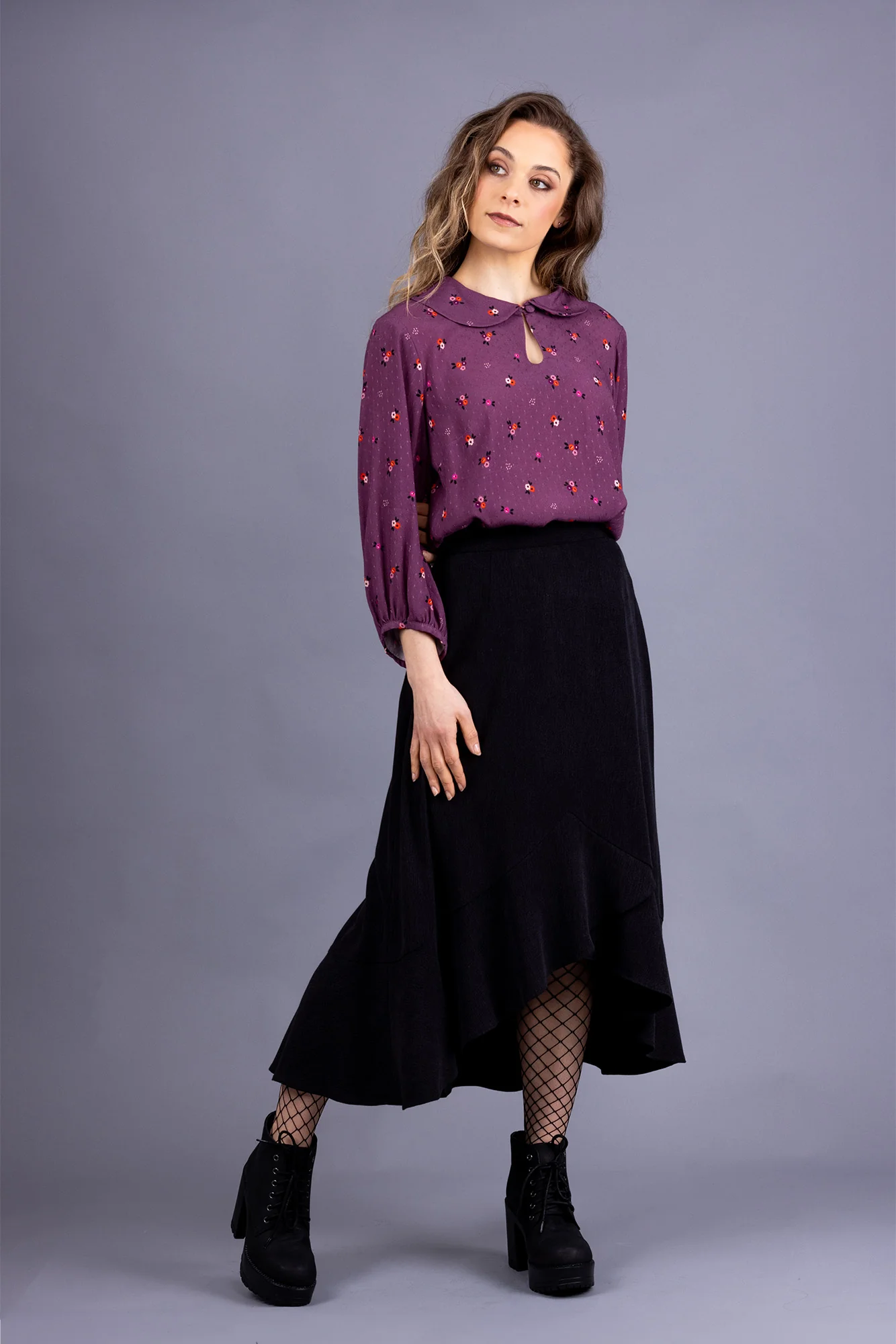 Buy the Helmi Blouse sewing pattern from Forget-me-not Patterns. Helmi is a semi-fitted blouse for lightweight woven fabrics. It features two different collar styles and two optional ruffles so you can choose the vibe! The blouse pulls over the head, so the only opening is at the neckline. The bishop sleeves gather into a binding, and have full-length and three-quarter length options. Side bust darts and back darts give a lightly tailored fit, and three different bust options are included to make fitting easier.