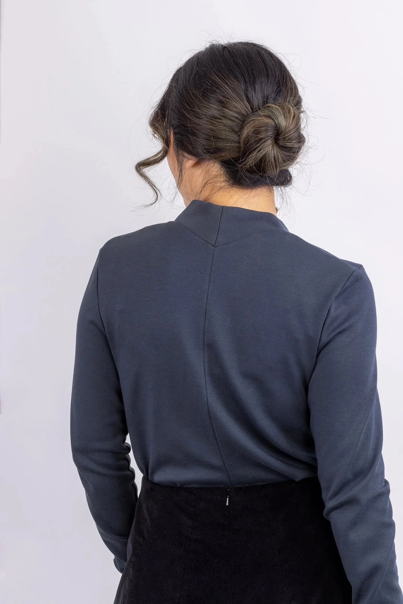Choose from two neckline options: collarless (which is a simpler sew), or an asymmetric collar that complements the diagonal style lines. The back has a shaped centre back seam and a gentle V-shaped neckline. The sleeves come in three length options: three-quarter length, full length, and past the wrist. While fitted at the shoulders and hem, the bust and waist are less fitted. Viola is perfect for drapey knits.