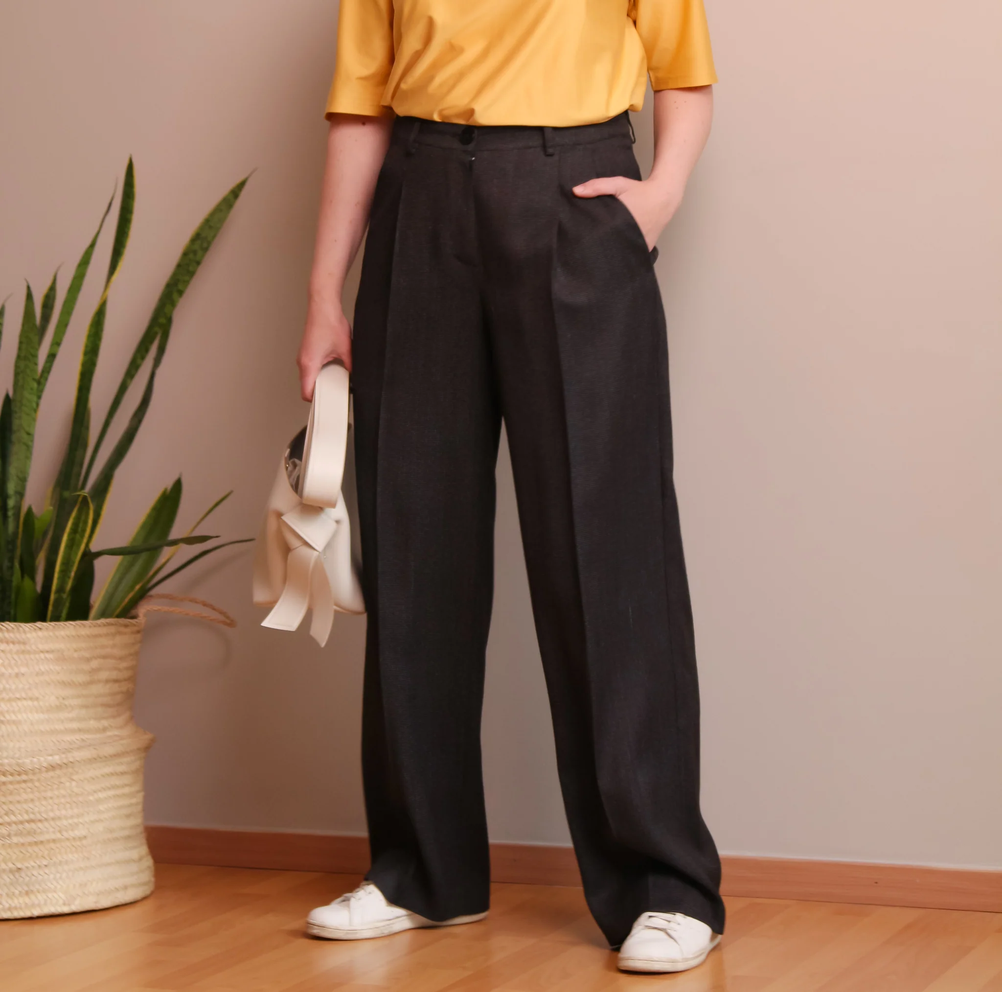 Buy the Stas Trousers sewing pattern from Lenaline Patterns. These straight, wide trousers have front pleats, side pockets and a false welt pocket at the back. They have a slightly lowered waistline and a shaped waistband with belt loops. The pants are fastened with a fly and a button at the waistband. The length is below the ankle.