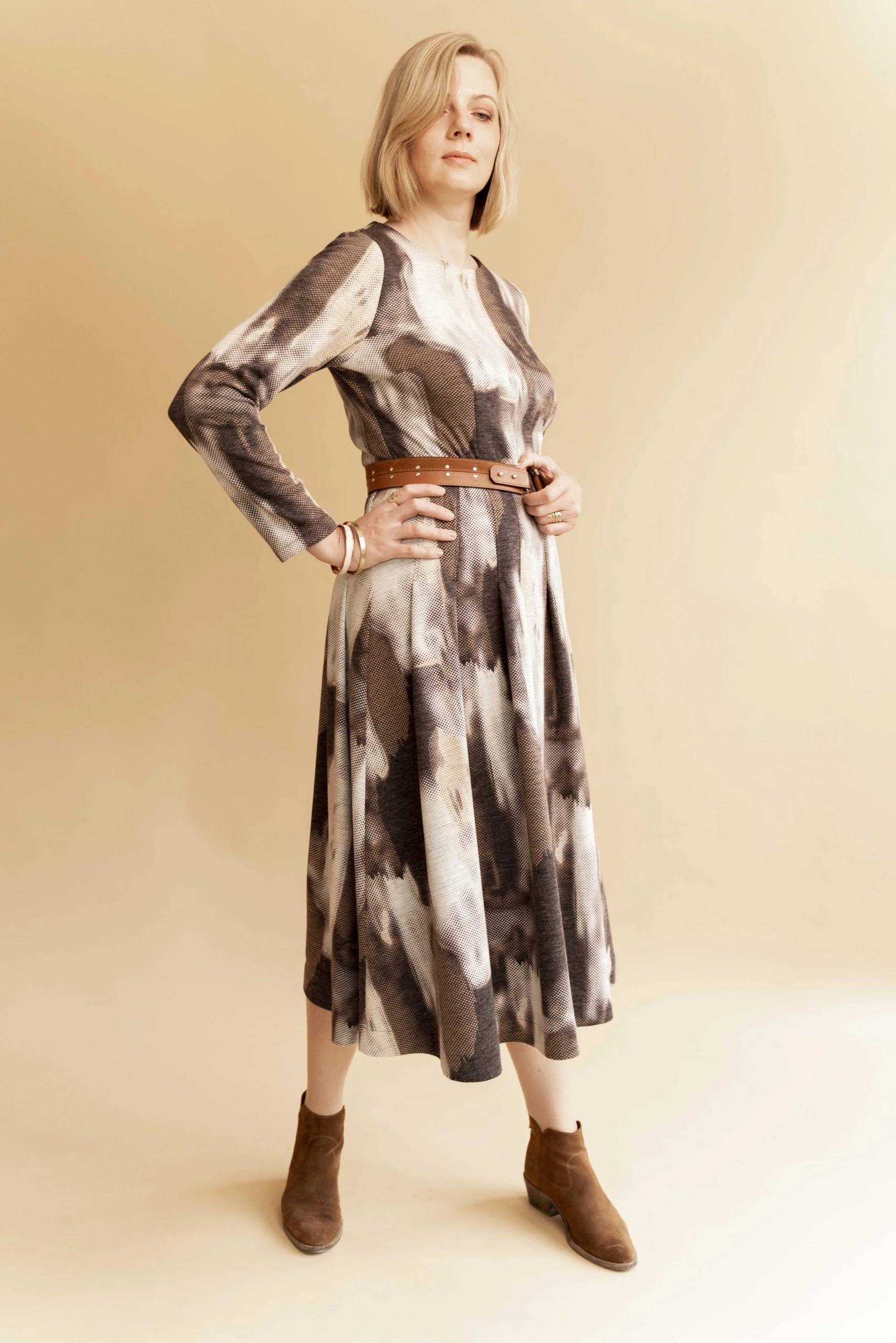 Buy the Vika Dress sewing pattern from Lenaline Patterns. The bodice is fitted with darts at the bust, waist and back. The shoulder line has been shortened to create a beautiful armhole, and you can make Vika with or without sleeves. The skirt has stitched folds around the hips, and there are two length options: midi length or shorter. Vika closes with an invisible zipper at the back.