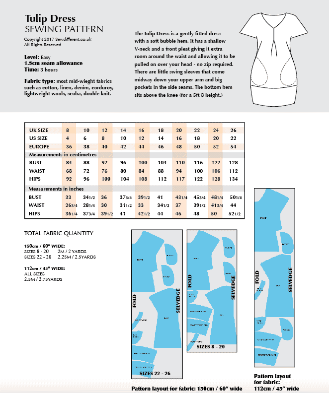 Buy the Tulip Dress sewing pattern from Sew Different. The Tulip Dress is a gently fitted dress with a soft bubble hem. It has a shallow v-neck and a front pleat giving it extra room around the waist and allowing it to be pulled on over your head - no zip required. There are little swing sleeves that come midway down your upper arm and big pockets in the side seams. The bottom hem sits above the knee (for 5' 8" height).
