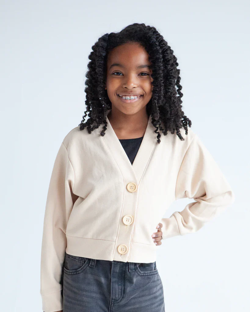 Buy the Children's Mini Marlo Sweater sewing pattern from True Bias. The Mini Marlo is a unisex, oversized sweater with a dropped shoulder, deep V-neck, wide bands and large buttons. View A is cropped, hitting a few inches below the natural waistline. View B has patch pockets and hits just below the hip.