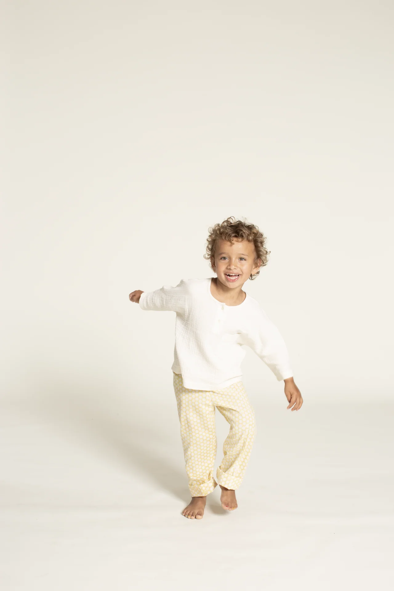 Buy the Children's Una Shirt sewing pattern from Wardrobe by Me. This simple top features a round neckline, front placket, chest pocket, and grown-on sleeves. The sleeves can be short, 3/4 or long.